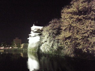 ライトアップされた城と、堀の水面に届きそうな桜。