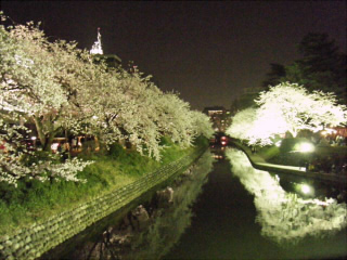 松川にかかる橋から観桜会のライトアップされた桜を臨む。