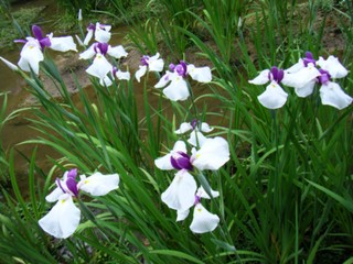 ・かきつばたも水辺に生えてて、葉脈もあるけど細く、花弁の付け根の紋が白い。