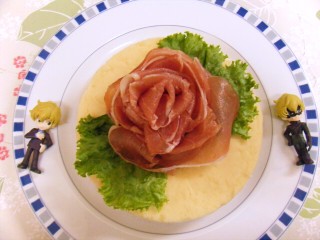 マッシュポテトを突き固め、生ハムで花を作って飾った。