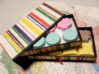 ジャイアントポッキー、レインボー。 七つの味わいの七色のポッキー。 チョコ、抹茶、バナナ、オレンジ、ストロベリー、グレープ、ブルーベリー。 ブルーベリー味は水色…! 真っ先にこれを食べてみたところ、ブルーベリー味のガムの味がした。 他のも、香料満載のやっすいガムみたいな味がした。 一番美味しいのは軸の部分かな! |